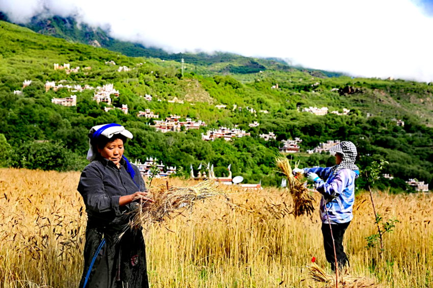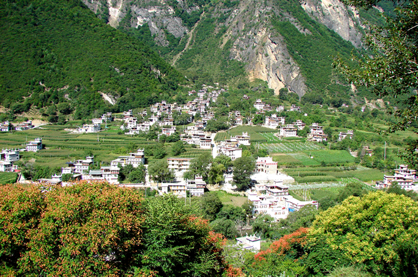 緊挨著草坪,是寨子里人們賴以生存的梯田。由于這里海拔較高的緣故,因此,只出產(chǎn)一些適應(yīng)在高原生長的胡豆、豌豆和青稞等農(nóng)作物。有時候,趁我們在水中嬉戲打鬧的時候,那些牛羊偷偷地跳進(jìn)莊稼地里。遠(yuǎn)處傳來“伊拉哇啦”的叫喊聲,我們連忙從水中爬出來,迅速地穿上衣物,向著莊稼地跑去。在田地旁,一位白發(fā)蒼蒼的老阿婆揮舞著雙手,一邊驅(qū)趕著地里的牛羊,一邊向我們大喊大叫。只是,這位阿婆由于天生不會說話,只會發(fā)出“伊拉哇啦”的聲響。為此,我們是不怕她的,占據(jù)有利的地勢,學(xué)著她的樣子。老人非常的氣憤,邁動著不甚靈活的腳步向我們走來。然而由于年老體衰,在我們這一群行動敏捷的小孩面前,只好作罷。每每此時,我們用藏語一起喊道“啞巴啞巴,能耐我何”。如今回想起來,確實不該,只是作為小孩,也只能自嘲小孩無罪了。