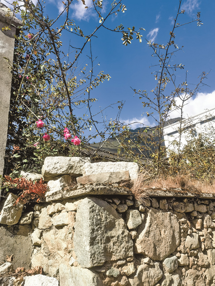 在小飯館里簡(jiǎn)單吃了一頓午餐,可惜沒有嵐安豆花,臘肉倒是如大家說(shuō)的那樣香。吃完飯?jiān)诖遄永锫o(wú)目的的轉(zhuǎn)悠,石頭砌的矮墻將每家每戶的房屋圍成院子,墻頭上的草已經(jīng)泛黃枯萎,偶爾有幾枝玫紅色的月季從墻頭伸出來(lái),給石墻點(diǎn)綴了一些色彩和生機(jī)。石墻與石墻之間,是串聯(lián)起每一戶人家的村間小道,經(jīng)過(guò)幾戶農(nóng)家,腳下硬化的路面斷了,往前延伸的是窄小的泥路,路兩旁有綠油油的菜地,有收割完的玉米地,有一排排的蘋果樹……往更遠(yuǎn)的地方看去,田地盡頭的山坡上是紅軍紀(jì)念碑,原來(lái)這里可以通往紀(jì)念碑,不過(guò)目測(cè)距離有點(diǎn)遠(yuǎn),收住腳步往回走,沿著村道朝另外一個(gè)方向走走看。前面是散落在小山坡上的幾戶人家,比起之前被石墻圍起看不見樣貌的農(nóng)家,山坡上的這些房子錯(cuò)落有致,清楚的看得見院子的全貌,房屋大多是一層的由石墻瓦頂構(gòu)筑的,每一戶人家都飄揚(yáng)著鮮艷的紅旗。