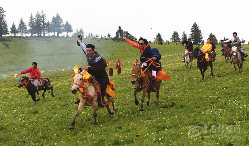 從康巴漢子村到郭崗頂,僅需半小時。極目群山,錯落有致、狀似蓮花瓣的八座山峰向你頷首致意,在郁郁蔥蔥的森林之間驀然有一塊綠蔭草甸,遠遠望去恰似中國行政區(qū)劃圖,而星星點點的牦牛猶如地圖上明顯的標示物,讓人嘆為觀止。郭崗頂曾經(jīng)是茶馬古道,其因遍地盛開一種叫郭崗花的藏紅花而被命名。眾多的文人墨客在此留下千古絕唱,使得郭崗頂充滿了童話般的色彩。置身在鮮花爛漫的花海中,俯瞰康巴漢子村的富庶寧靜,讓人感到心曠神怡。郭崗頂有兩個湖泊,叫尼瑪達瓦措,就是日月湖的意思,被稱為是郭崗頂?shù)难劬?。如果是在月朗星稀之夜,日月湖湖中有月,蔚景致迷人,讓人稱奇。當漫山遍野的郭崗花盛開的時候,郭崗蓮花寶頂象傳說中的長壽老人唱著古老的山歌、臉上綻開慈祥的笑容,用寬厚的手掌迎接著遠道而來的客人們,那些常年被郭崗花簇擁著的古建筑遺址,那些被殘垣斷壁合圍的千年古柏訴說著古老的歷史,不管是風光秀麗的郭崗頂,還是雄姿英發(fā)的康巴漢子,這里都是你心馳神往的地方。