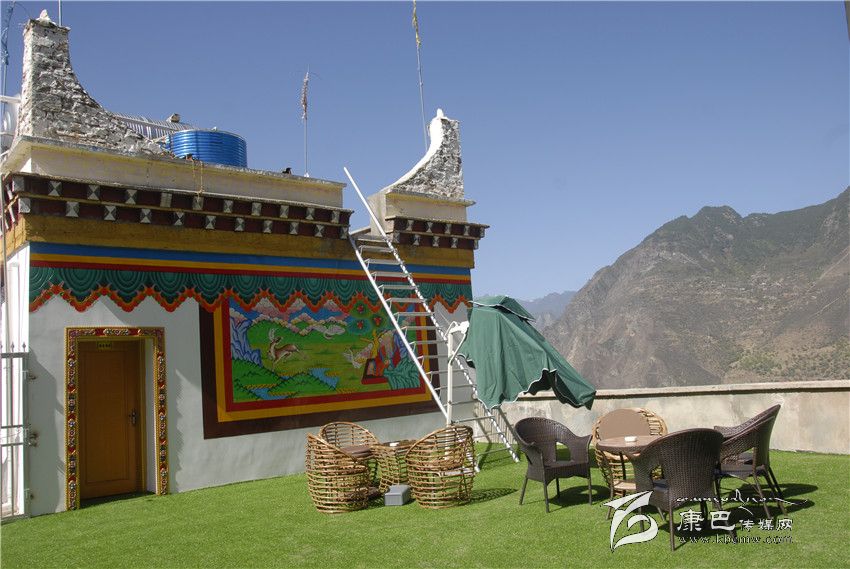 客棧的設(shè)計完全是藏式風(fēng)格,很吻合楊荻給客棧起的名字:圣地映像。從大廳開始一直到客房,金碧輝煌、雕梁畫棟,每一處空間都被藏地色彩充滿。樓頂,視野開闊,左手青山,右手青天。幾個內(nèi)江來的客人已在客棧呆了好幾天,他們正在燦爛陽光下商量爬山的事,他們一再和楊荻碰面,希望晚上回到客棧能吃上本地的土雞。