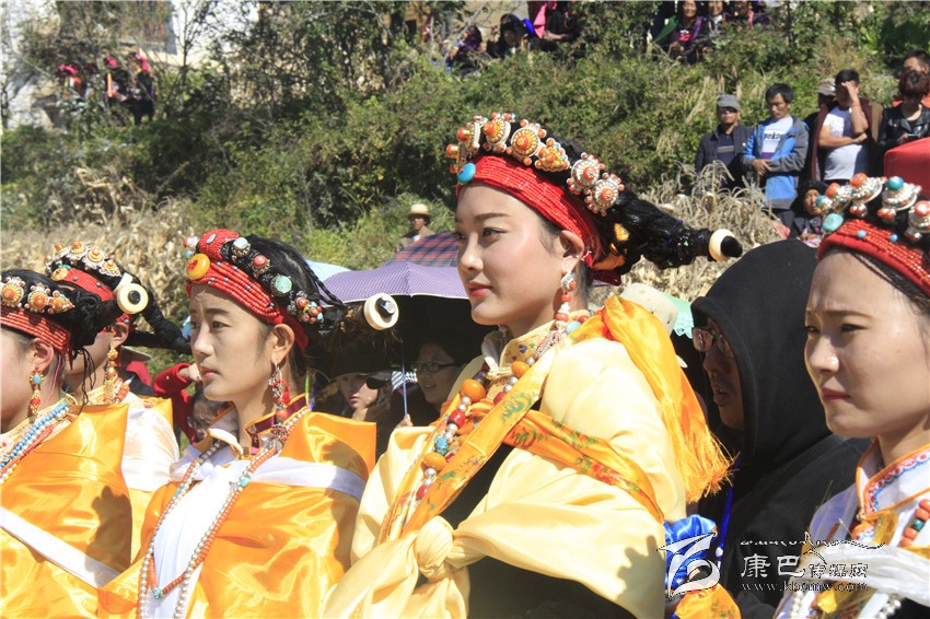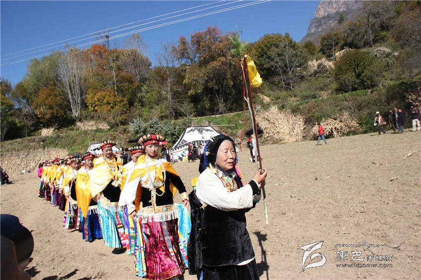 所有的祈福儀式結(jié)束后,村子里一位德高望重的長(zhǎng)輩走上圓臺(tái),用雄渾有力的嗓音向場(chǎng)地外等候的人們發(fā)出指令。在一段念詞結(jié)束之后,參加成人儀式女孩們的父親們?cè)谝晃焕先说闹敢戮従彽南驁?chǎng)地中央走來,老人手舉一幅一米高的唐卡畫,口中念念有詞,走在他后面的父親們一襲白色的毪衫,頭戴一頂灰色的禮帽,腳穿紅黑相間的藏靴,頸上掛著一根潔白的哈達(dá),滿臉肅然的緊隨老人之后,來到月形的臺(tái)子邊,站成一個(gè)半圓形。當(dāng)父親隊(duì)站定后,母親隊(duì)們也向場(chǎng)地中移步而來,本次成人儀式的主角們?cè)谝晃焕习尩膸ьI(lǐng)下向場(chǎng)地中走來,每一位女孩穿著打扮都是那么的光鮮靚麗,每一個(gè)人都顯得美麗動(dòng)人,她們披著黃色的披風(fēng),一根白色的哈達(dá)在胸前打著結(jié),五顏六色的哈達(dá)懸掛在這根哈達(dá)上,在姑娘們的后背迎風(fēng)飄飛。走到圓臺(tái)邊,小女孩們也圍成半圓,低著頭,等待著喇嘛們的念經(jīng)祈福和家人的祈福。此時(shí),兩位吉祥老人站了起來,手中拿著凈瓶,走到姑娘們面前,一邊念誦經(jīng)文,一邊將手中凈瓶里的水倒在姑娘們的手心里,姑娘們則虔誠(chéng)的將這圣水輕輕的抹在自己的額頭上,寓意吉祥如意。待喇嘛主持儀式結(jié)束后,主持儀式的老人用嘉絨語向蒼天和墨爾多神山祈禱,希望神賜予孩子們美麗的面容和美好的心靈,從今日起,她們就可以真正的長(zhǎng)大成人了。吉祥詞念誦完后,母親們排著長(zhǎng)長(zhǎng)的隊(duì)伍緩緩來到孩子們的面前,將懸掛在胸前的哈達(dá)取下,久久的凝視著女兒的臉,眼角掛著幸福的淚水,用顫抖的聲音為女兒祈福,叮囑孩子們要孝敬父母,做一個(gè)正直善良的人,然后,才將白色的哈達(dá)掛在女兒的頸上,父親們則站在原地,看著母親們將哈達(dá)和祝福送給女兒,見證著女兒們的長(zhǎng)大成人。接受完父母和長(zhǎng)輩們的祝福之后,盛大的鍋莊舞會(huì)開始了。小女孩們也跟隨著這些舞者們手牽著手走到場(chǎng)地中央,跳起歡快的鍋莊舞。擁忠大娘說,成年禮上的鍋莊舞會(huì)一般都要視參加成人禮儀式女孩們親戚多寡而定,每一名長(zhǎng)輩都會(huì)走到場(chǎng)地中牽頭,跳起舞蹈,這時(shí)候是女孩的長(zhǎng)輩們炫耀舞技和歌聲的時(shí)候,他們矯健的舞步和甜美的歌喉迎來眾人的和鳴。