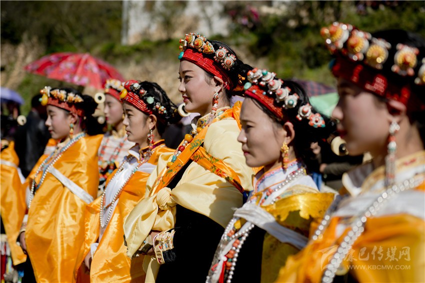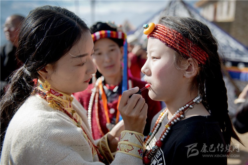 盤(pán)好發(fā)髻,佩戴好頭飾,在肩、背系好五彩哈達(dá)后,由本村具有威望的女性長(zhǎng)者引領(lǐng)來(lái)到儀式現(xiàn)場(chǎng)。法號(hào)聲中,煨桑的青煙裊裊升起,威嚴(yán)的活佛主持誦經(jīng)祈福儀式。隨后,德高望重的長(zhǎng)者為參加儀式的女子送祝福茶,長(zhǎng)輩為姑娘們獻(xiàn)哈達(dá)。一系列儀式結(jié)束后,無(wú)論男女老少,都來(lái)到場(chǎng)地中央,踏歌起舞,跳起吉祥的鍋莊。