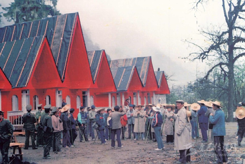 海螺溝旅游開(kāi)發(fā)建設(shè)團(tuán)隊(duì)部分成員在三號(hào)營(yíng)地召開(kāi)現(xiàn)場(chǎng)辦公會(huì)。(1987年8月攝)