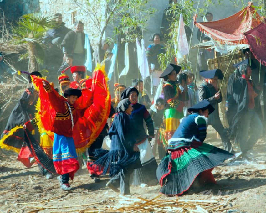 我?guī)е纸o我準(zhǔn)備的迎親酒向李木坪走去。我激動(dòng)、欣慰,然而也深感惶恐不安。激動(dòng)欣慰的是我就要看到我日夜思念的新娘了,惶恐不安的是我怕被新娘的“近衛(wèi)軍”們捉住,罰酒背新娘。護(hù)送新娘到男方家完婚的全都是清一色的男性,有新娘的長(zhǎng)輩、哥哥、弟弟、表兄弟等等。按彝家的風(fēng)俗,新郎如果在戒備森嚴(yán)中摸到新娘,就讓“近衛(wèi)軍”們乖乖地把新娘背到新郎家里;如果摸不到,不僅新郎被罰酒,而且新郎還得老老實(shí)實(shí)把新娘背到家里。罰酒、背新娘倒不在乎,就怕站在遠(yuǎn)處看熱鬧的小伙和姑娘們奚落一通,說(shuō)摸不到新娘是沒(méi)本事的新郎。