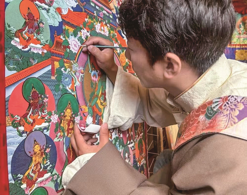 “唐卡作為中國民族繪畫藝術(shù)的珍品,不僅呈現(xiàn)精湛的技藝和美學(xué),更是傳遞一種文化。”楊登表示,他作為一名縣級非遺傳承人,要在繼承傳統(tǒng)技藝的基礎(chǔ)上,采用多元藝術(shù)技藝賦予傳統(tǒng)唐卡更多創(chuàng)意,讓民族文化瑰寶能夠更好地發(fā)揚(yáng)光大。