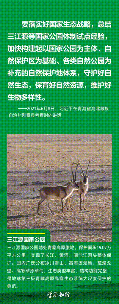 “生物多樣性使地球充滿生機(jī),也是人類生存和發(fā)展的基礎(chǔ)?!蓖七M(jìn)以國家公園為主體的自然保護(hù)地體系建設(shè),是習(xí)近平總書記作出的重要部署。三江源、大熊貓、東北虎豹、海南熱帶雨林、武夷山等首批國家公園正式設(shè)立以來,生態(tài)功能持續(xù)向好,對保護(hù)生物多樣性、推進(jìn)人與自然和諧共生的現(xiàn)代化具有重要意義。
