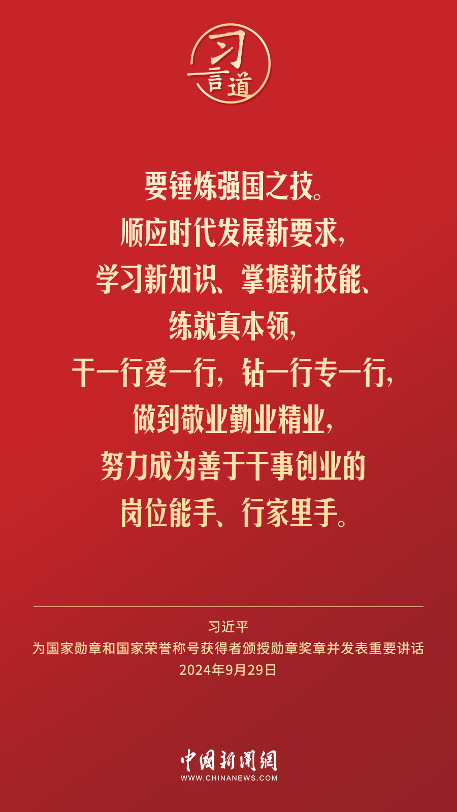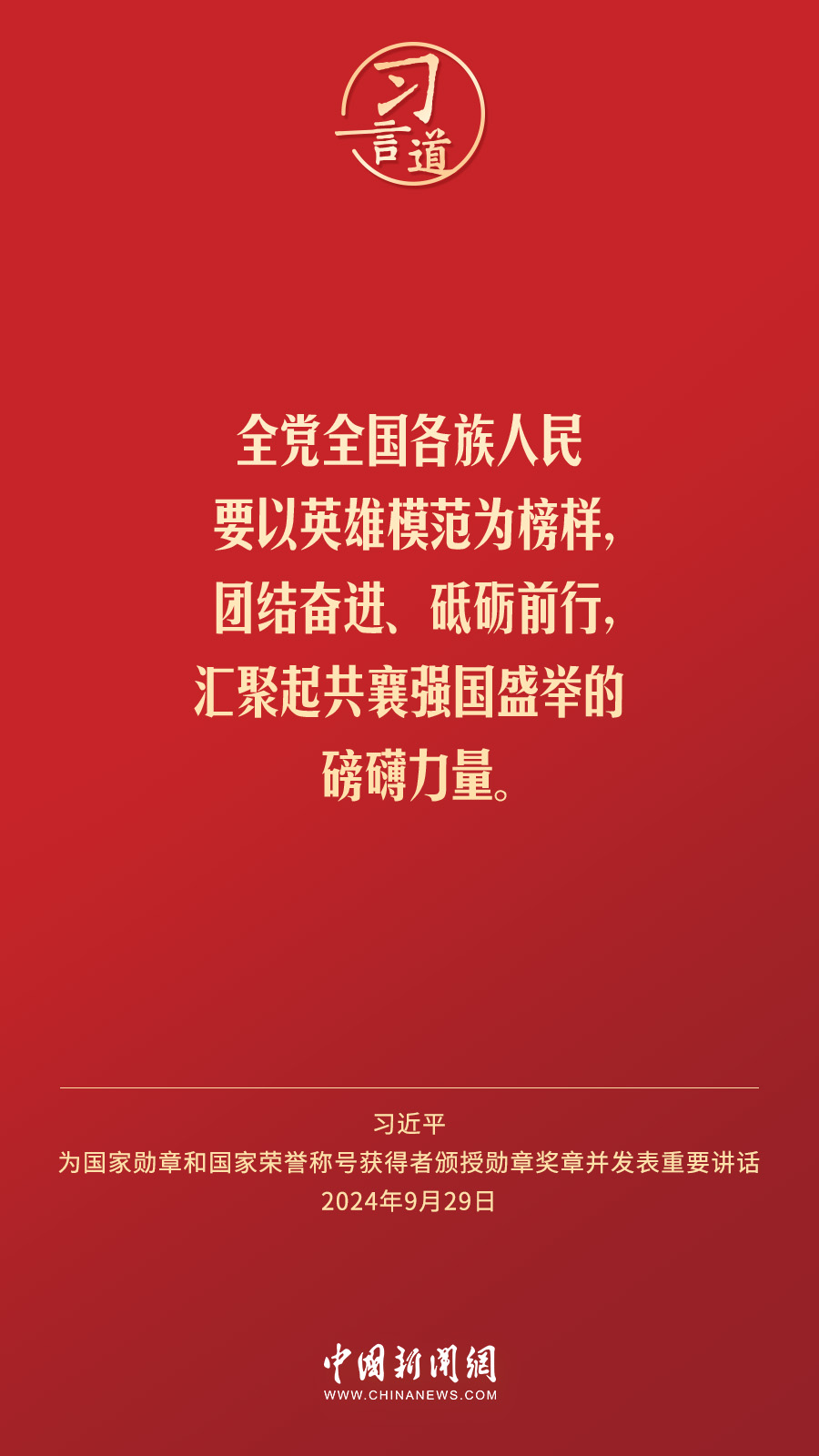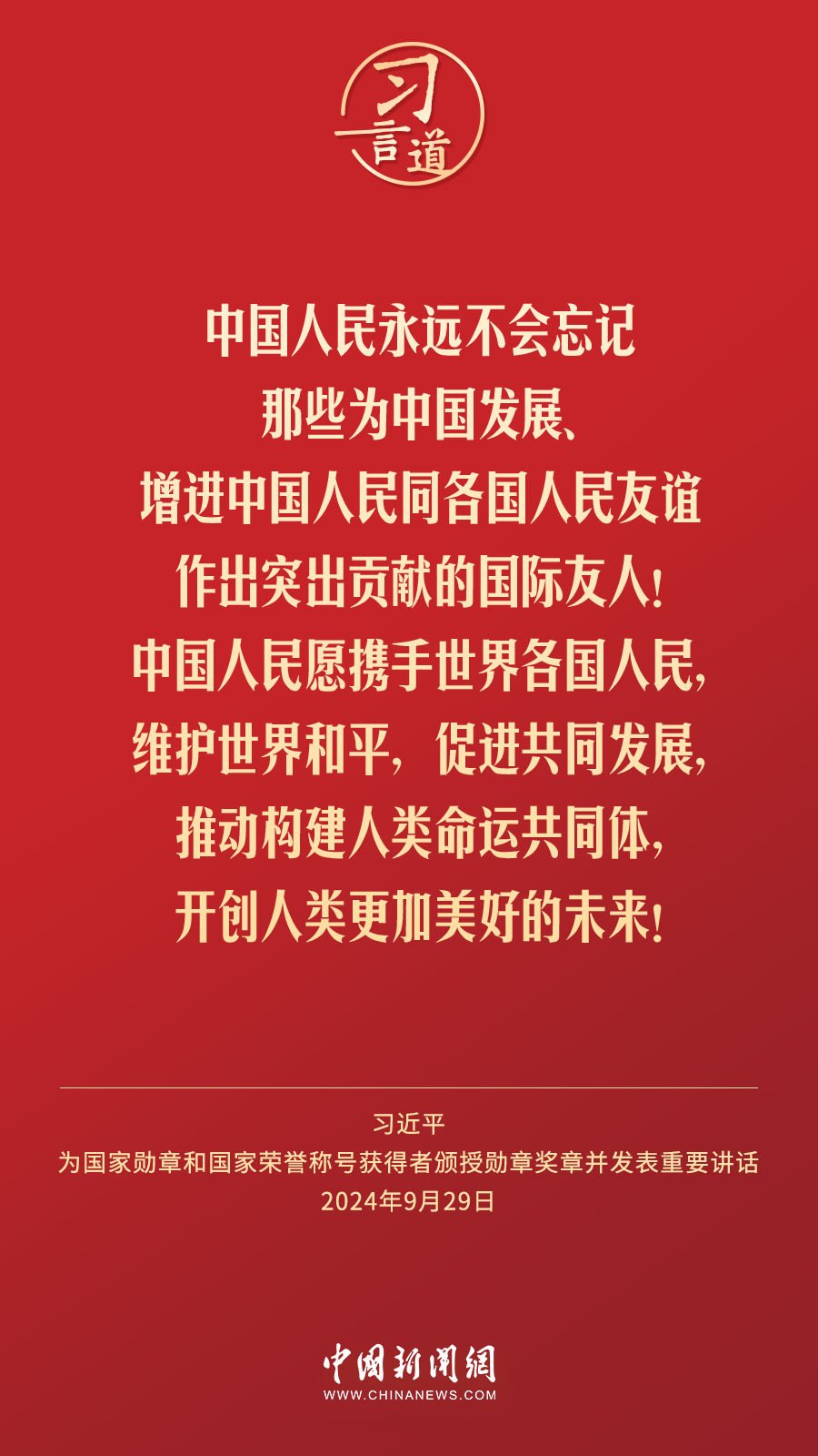經(jīng)中共中央批準(zhǔn),中華人民共和國(guó)國(guó)家勛章和國(guó)家榮譽(yù)稱(chēng)號(hào)頒授儀式于9月29日上午10時(shí)在人民大會(huì)堂隆重舉行。中共中央總書(shū)記、國(guó)家主席、中央軍委主席習(xí)近平向國(guó)家勛章和國(guó)家榮譽(yù)稱(chēng)號(hào)獲得者分別授予“共和國(guó)勛章”“友誼勛章”和國(guó)家榮譽(yù)稱(chēng)號(hào)獎(jiǎng)?wù)虏l(fā)表重要講話。習(xí)近平指出——