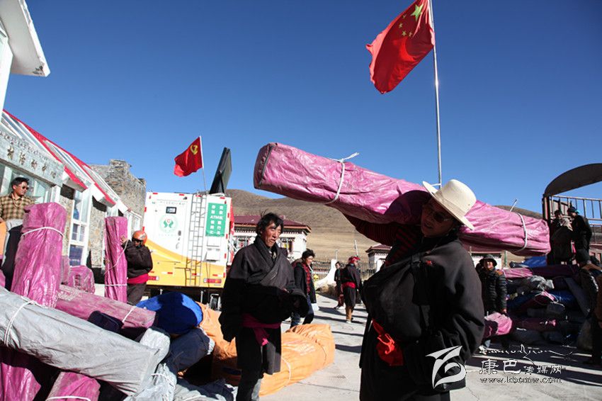 塔公鄉(xiāng)江巴村支部書(shū)記呷讓加帶頭在搬運(yùn)救災(zāi)物資。