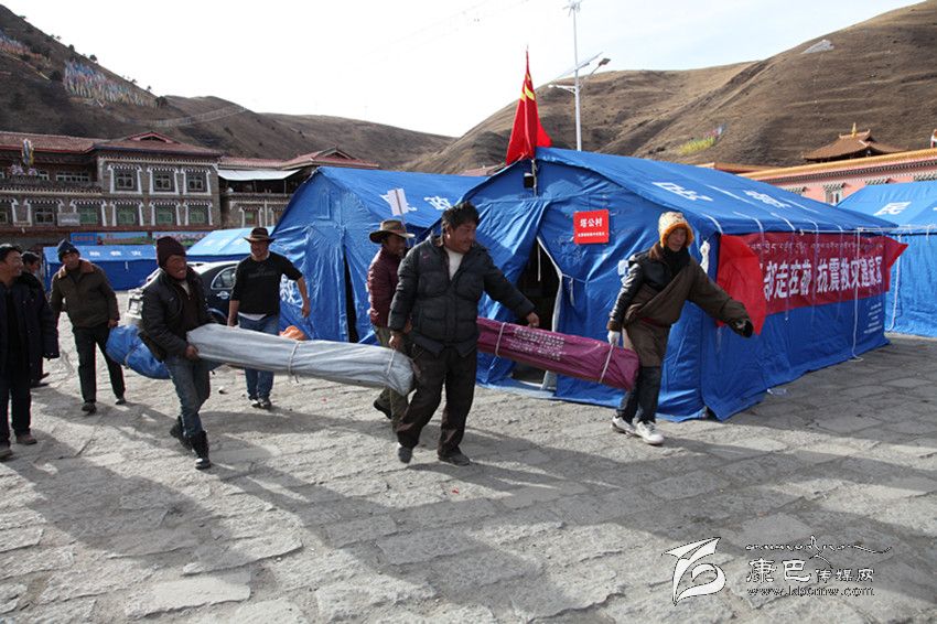 塔公鄉(xiāng)塔公村黨員服務(wù)隊(duì)在支書(shū)張東升的帶領(lǐng)下為災(zāi)民搭建帳篷。