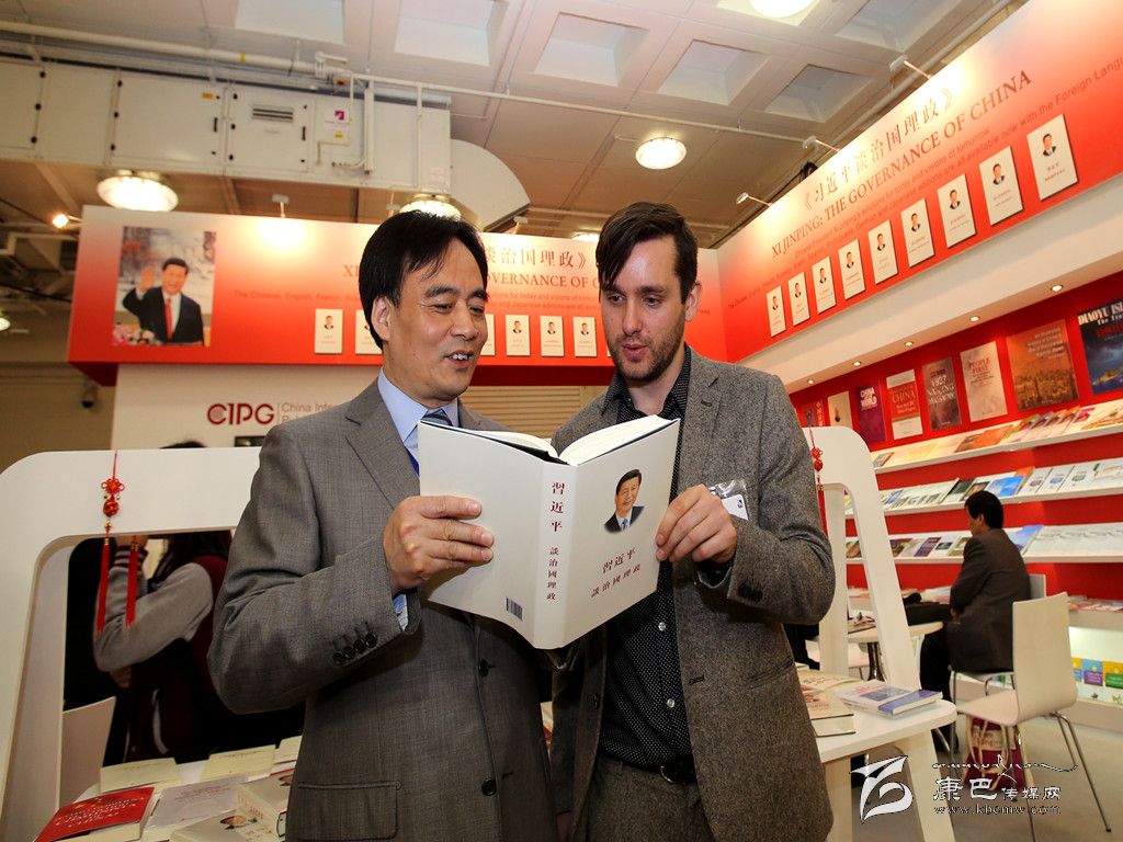 4月14日,中國國際出版集團副總裁陸彩榮(左)在倫敦書展上向一名英國讀者介紹《習近平談治國理政》(繁體中文版)一書。第44屆倫敦書展當天正式開幕。首次亮相倫敦書展的《習近平談治國理政》多文種版圖書受到各界的極大關(guān)注,成為本屆書展中國展團的一大亮點。陸彩榮在倫敦書展上宣布,《習近平談治國理政》一書全球發(fā)行量突破400萬冊,其中海外發(fā)行40萬冊,這是改革開放以來,中國國家領(lǐng)導人著作海外發(fā)行的最高紀錄。新華社記者 韓巖 攝