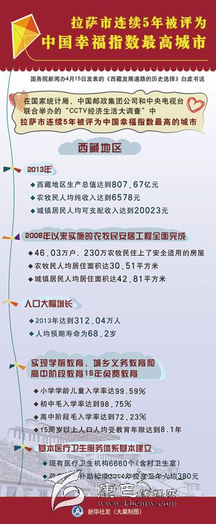 新華社北京4月15日電(記者張曉松、郭麗琨)白皮書說,西藏絕大多數(shù)人口擺脫了延續(xù)上千年的貧困,基本達到了小康生活水平。在國家統(tǒng)計局、中國郵政集團公司和中央電視臺聯(lián)合舉辦的“CCTV經(jīng)濟生活大調(diào)查”中,拉薩市連續(xù)5年被評為中國幸福指數(shù)最高的城市。