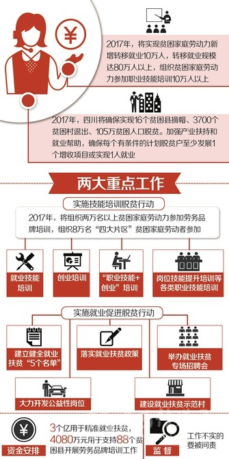 2017年,四川要“確保實現(xiàn)16個貧困縣摘帽、3700個貧困村退出、105萬貧困人口脫貧。加強產(chǎn)業(yè)扶持和就業(yè)幫助,確保每個有條件的計劃脫貧戶至少發(fā)展1個增收項目或?qū)崿F(xiàn)1人就業(yè)”的目標(biāo)。