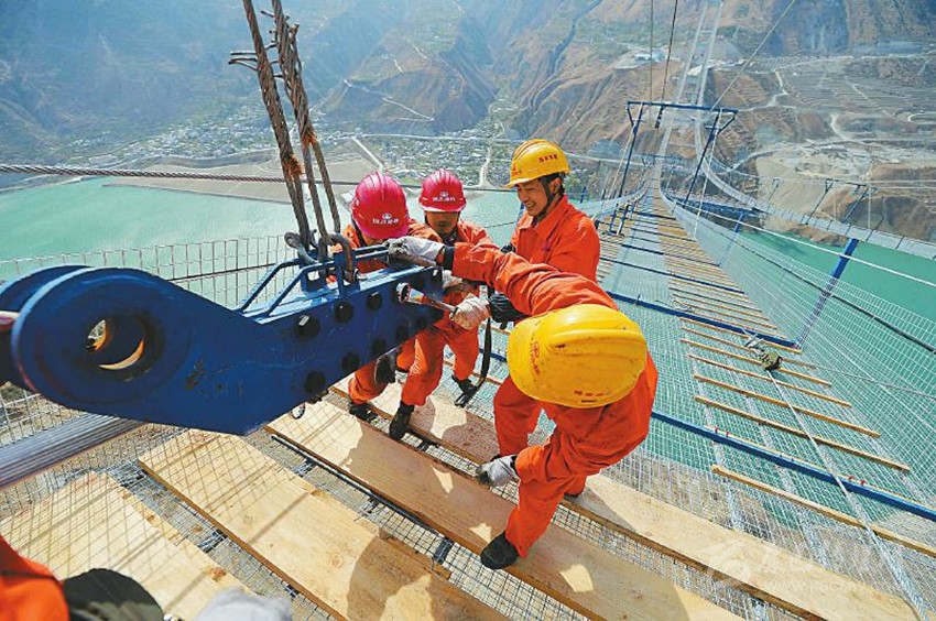 工作人員正在調(diào)試主纜。