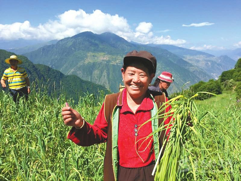 彭州市引入彭州蔬菜協(xié)會(huì)、彭州萱源農(nóng)業(yè)有限公司在黑水縣雙溜索鄉(xiāng)俄瓜村建設(shè)100畝大蒜標(biāo)準(zhǔn)化種植基地。圖為貧困群眾采收蒜薹。