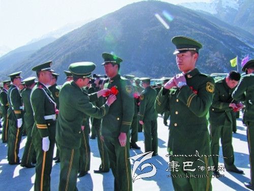 圖為戰(zhàn)友為老兵佩戴光榮花。