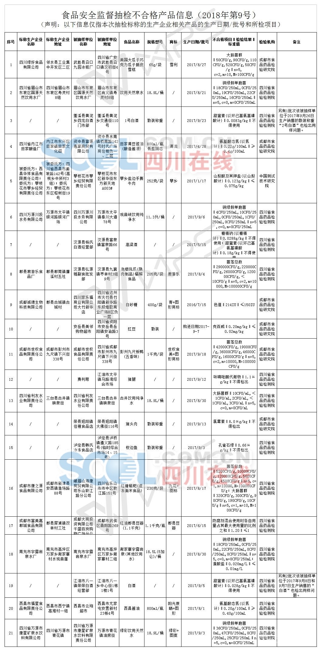 四川在線消息(記者 周偉)2月22日,節(jié)后上班第一天,省食品藥品監(jiān)督管理局公布的新一批食品抽檢信息顯示,該局近期組織抽檢了食用農(nóng)產(chǎn)品、餐飲食品、食用油、油脂及其制品、調(diào)味品、乳制品、酒類、冷凍飲品、肉制品、食糖、速凍食品等10個(gè)類、371批次食品。其中,抽檢合格食品347批次,不合格食品24批次,其中,郫縣豆瓣、九尺板鴨、西昌醬油、鹽邊手撕牛肉等四川地方特色食品檢出問題食品。