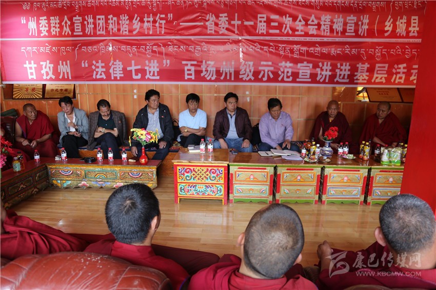 本網(wǎng)訊 按照州委統(tǒng)一安排部署,7月27日下午,州委群眾宣講團(tuán)深入色達(dá)縣色柯鎮(zhèn)東嘎寺開展了“州委群眾宣講團(tuán)和諧鄉(xiāng)村行”——省委十一屆三次全會精神暨“法律七進(jìn)”百場州級示范宣講進(jìn)基層活動。