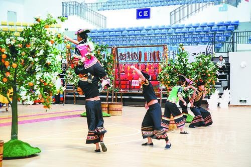 雅安市代表團教練李鏡文告訴記者,《石炯諧博》表演項目依托當(dāng)?shù)匾图颐袼?,在黃果柑豐收的季節(jié),石棉縣彝族小伙、姑娘們在果林里采摘黃果柑時所產(chǎn)生的勞動趣味競技活動的演繹,反映了少數(shù)民族地區(qū)經(jīng)濟發(fā)展、社會繁榮穩(wěn)定、各族人民安居樂業(yè)的生活和精神風(fēng)貌。