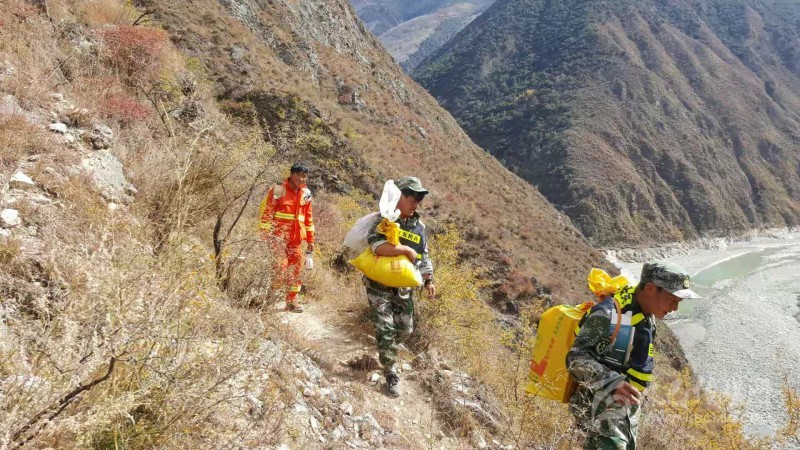 車輛無(wú)法前行,白玉縣民兵以及相關(guān)應(yīng)急隊(duì)伍將救災(zāi)物資順著小路背上現(xiàn)場(chǎng)