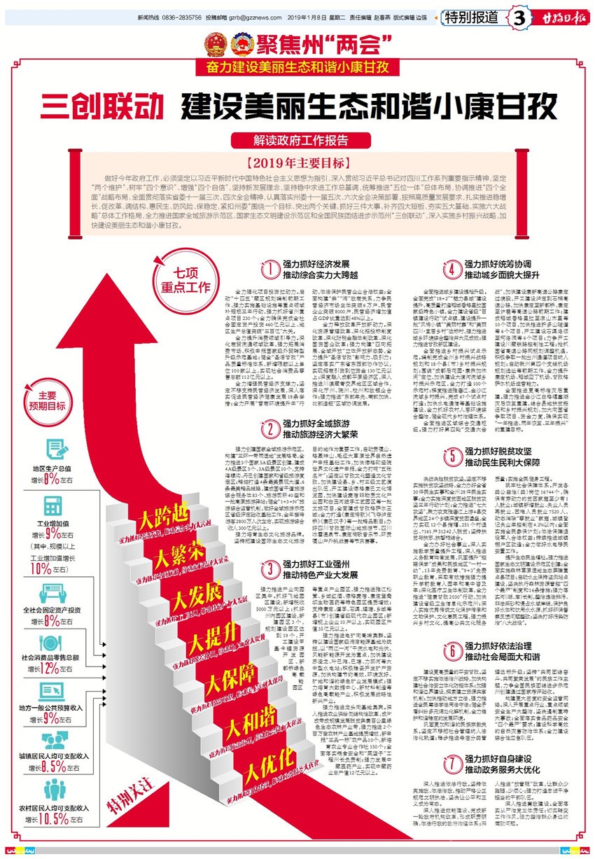肖友才指出,今年發(fā)展形勢(shì)更加復(fù)雜、發(fā)展任務(wù)更加繁重,我們必須緊緊抓住大有可為的重要戰(zhàn)略機(jī)遇期和政策紅利“窗口期”,統(tǒng)籌兼顧、突出重點(diǎn)、突破難點(diǎn),全力保持經(jīng)濟(jì)社會(huì)高速度與高質(zhì)量并重發(fā)展良好態(tài)勢(shì),重點(diǎn)做好以下工作:一是強(qiáng)力抓好經(jīng)濟(jì)發(fā)展,推動(dòng)綜合實(shí)力大跨越。堅(jiān)持把項(xiàng)目投資作為推動(dòng)高質(zhì)量發(fā)展的重中之重,全力確保完成全社會(huì)固定資產(chǎn)投資460億元以上、地區(qū)生產(chǎn)總值突破“三百億”大關(guān);深化商貿(mào)流通領(lǐng)域改革,強(qiáng)力拓展消費(fèi)市場(chǎng),健全“圣潔甘孜”產(chǎn)品質(zhì)量標(biāo)準(zhǔn)體系,實(shí)現(xiàn)社會(huì)消費(fèi)品零售總額112億元以上;堅(jiān)定不移支持民營(yíng)經(jīng)濟(jì)發(fā)展,力爭(zhēng)民營(yíng)經(jīng)濟(jì)市場(chǎng)主體突破6萬(wàn)戶、民營(yíng)企業(yè)突破8000戶,民營(yíng)經(jīng)濟(jì)增加值占GDP比重達(dá)到48%以上;堅(jiān)持以供給側(cè)結(jié)構(gòu)性改革為主線,強(qiáng)力推動(dòng)各項(xiàng)改革任務(wù)落地見(jiàn)效。二是強(qiáng)力抓好全域旅游,推動(dòng)旅游經(jīng)濟(jì)大繁榮。堅(jiān)定不移實(shí)施產(chǎn)業(yè)富民戰(zhàn)略,全力推進(jìn)以全域旅游為核心的生態(tài)優(yōu)先、綠色發(fā)展,強(qiáng)力構(gòu)建“三環(huán)一帶兩濕地”發(fā)展格局,全力打造世界重要旅游目的地和國(guó)家全域旅游示范區(qū);堅(jiān)持把建設(shè)國(guó)際生態(tài)文化旅游目的地作為重要工作,全力打響中國(guó)最美雪山、中國(guó)最美濕地、中國(guó)最美草原、中國(guó)最美藏寨、中國(guó)最美漢子“五張名片”,強(qiáng)力培育生態(tài)文化旅游品牌。三是強(qiáng)力抓好工業(yè)強(qiáng)州,推動(dòng)特色產(chǎn)業(yè)大發(fā)展。堅(jiān)定不移實(shí)施工業(yè)強(qiáng)州戰(zhàn)略,堅(jiān)持“優(yōu)先發(fā)展新興產(chǎn)業(yè)、大力發(fā)展農(nóng)特加工產(chǎn)業(yè)、有序發(fā)展電礦產(chǎn)業(yè),大建園區(qū)、建大園區(qū),大建基地、建大基地,大建產(chǎn)業(yè)、建大產(chǎn)業(yè)”思路,強(qiáng)力推進(jìn)產(chǎn)業(yè)向園區(qū)集中;堅(jiān)持以建設(shè)國(guó)家級(jí)清潔能源基地為統(tǒng)攬,積極穩(wěn)妥開(kāi)發(fā)礦產(chǎn)資源,積極發(fā)展戰(zhàn)略性新興產(chǎn)業(yè),強(qiáng)力推進(jìn)電礦向高端集群;堅(jiān)持以建設(shè)現(xiàn)代高原特色農(nóng)牧業(yè)基地為重點(diǎn),深入推進(jìn)農(nóng)業(yè)供給側(cè)結(jié)構(gòu)性改革,強(qiáng)力推進(jìn)龍頭向基地集聚。四是強(qiáng)力抓好統(tǒng)籌協(xié)調(diào),推動(dòng)城鄉(xiāng)面貌大提升。堅(jiān)定不移實(shí)施城鄉(xiāng)提升戰(zhàn)略,堅(jiān)持“七管齊下”“四態(tài)合一”的思路,做強(qiáng)縣城、做優(yōu)鄉(xiāng)鎮(zhèn)、做美村寨,全面推進(jìn)城鄉(xiāng)建設(shè)提檔升級(jí);堅(jiān)定不移實(shí)施鄉(xiāng)村振興戰(zhàn)略,編制完成全州鄉(xiāng)村振興戰(zhàn)略規(guī)劃和18個(gè)縣(市)鄉(xiāng)村振興規(guī)劃,全面推進(jìn)鄉(xiāng)村振興試點(diǎn)示范;堅(jiān)定不移實(shí)施交通先行戰(zhàn)略,強(qiáng)力打好第四輪“交通大會(huì)戰(zhàn)”,全面推進(jìn)區(qū)域綜合交通樞紐;高標(biāo)準(zhǔn)編制災(zāi)后重建實(shí)施方案和項(xiàng)目清單,強(qiáng)力推進(jìn)金沙江白格堰塞湖災(zāi)后恢復(fù)重建。五是強(qiáng)力抓好脫貧攻堅(jiān),推動(dòng)民生民利大保障。堅(jiān)定不移實(shí)施扶貧攻堅(jiān)戰(zhàn)略,堅(jiān)持把脫貧攻堅(jiān)作為最大的政治責(zé)任、最大的民生工程、最大的發(fā)展機(jī)遇,決戰(zhàn)決勝脫貧攻堅(jiān);深入實(shí)施教學(xué)質(zhì)量提升工程,深化醫(yī)療衛(wèi)生體制改革,完善公共文化服務(wù)體系,全力辦好社會(huì)事業(yè);堅(jiān)持就業(yè)優(yōu)先,大規(guī)模開(kāi)展職業(yè)技能培訓(xùn),全面實(shí)施全民參保計(jì)劃,依法保障退役軍人合法權(quán)益,持續(xù)推進(jìn)城鎮(zhèn)棚戶區(qū)改造,全力做好水電移民安置工作,筑牢社會(huì)保障體系;堅(jiān)定不移實(shí)施生態(tài)文明建設(shè)戰(zhàn)略,嚴(yán)格落實(shí)“三線一單”制度,強(qiáng)力推進(jìn)國(guó)家生態(tài)文明建設(shè)示范區(qū)創(chuàng)建,提升生態(tài)民生福祉。六是強(qiáng)力抓好依法治理,推動(dòng)社會(huì)局面大和諧。堅(jiān)定不移實(shí)施依法治州戰(zhàn)略,深化“三區(qū)”維穩(wěn)體系和依法常態(tài)化治理,深入開(kāi)展反分裂斗爭(zhēng),建設(shè)更高質(zhì)量的平安甘孜;堅(jiān)定不移把社會(huì)管理納入法治化軌道,鞏固更加和諧的民族宗教關(guān)系;堅(jiān)定不移落實(shí)安全生產(chǎn)“黨政同責(zé)、一崗雙責(zé)、齊抓共管、失職追責(zé)”責(zé)任制,構(gòu)建更大密度的安全監(jiān)管網(wǎng)絡(luò)。七是強(qiáng)力抓好自身建設(shè),推動(dòng)政務(wù)服務(wù)大優(yōu)化。堅(jiān)持依憲施政、依法治政,自覺(jué)運(yùn)用法治思維和法治方式推進(jìn)政府工作,堅(jiān)決讓公平和正義成為常態(tài);完成新