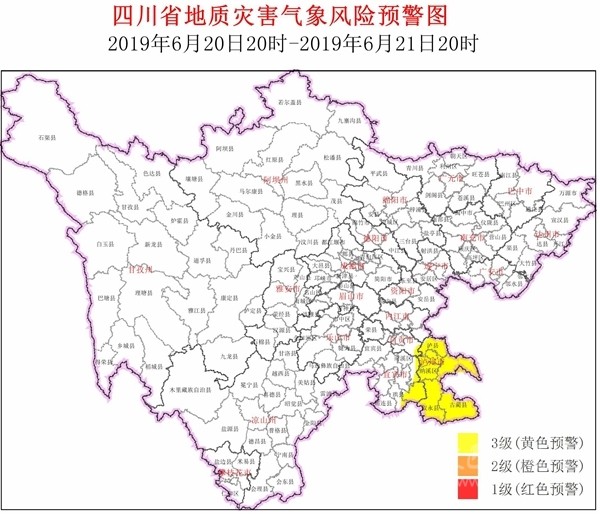 四川在線消息(記者 寇敏芳)6月20日,省自然資源廳發(fā)布全省地災(zāi)氣象風險預(yù)警。結(jié)合四川省氣象臺天氣預(yù)報情況,6月20日20時~6月21日20時,全省地質(zhì)災(zāi)害氣象風險預(yù)警等級為3級(黃色預(yù)警,注意級),具體結(jié)果如下: