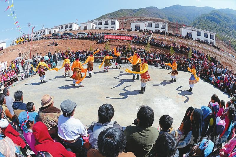 近日,甘孜州得榮縣白松鄉(xiāng)同歸村,藏族群眾聚集在一起慶祝搬遷新居。 省扶貧開發(fā)局供圖