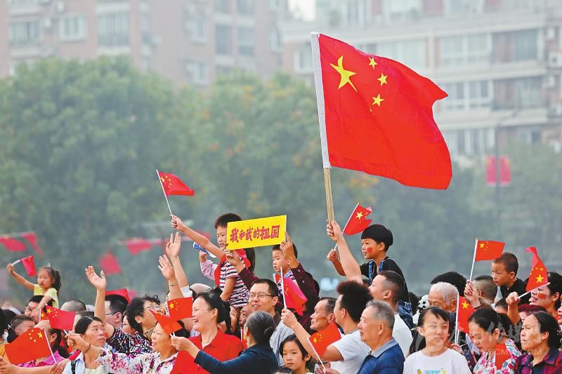 當(dāng)天,博愛(ài)新村飯店老板楊云剛特地準(zhǔn)備了一個(gè)大蛋糕,上面寫著“祝福新中國(guó)生日快樂(lè)”。當(dāng)莊嚴(yán)的國(guó)歌聲響起,早已守候在博愛(ài)新村飯店的人們跟著站起來(lái),揮舞國(guó)旗,唱起了國(guó)歌?!翱吹酵涞能婈?duì)特別激動(dòng)!”楊云剛說(shuō)。
