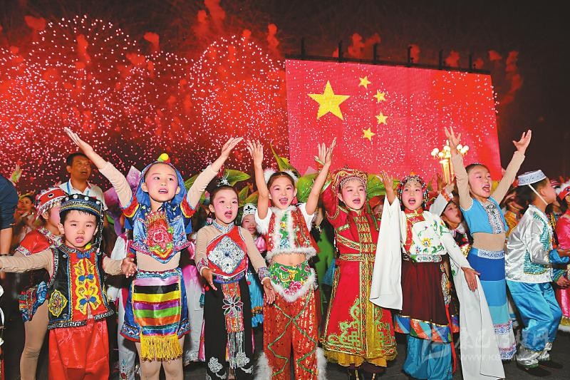 在世界最大的廣場(chǎng),上演著一場(chǎng)特殊的“快閃”:少年兒童從金水橋走來,稚嫩的童聲響亮。國(guó)旗旗桿旁的戰(zhàn)士在唱,身著盛裝的各民族代表在唱,和睦幸福的一家人在唱……全場(chǎng)聯(lián)歡群眾和現(xiàn)場(chǎng)觀眾形成氣勢(shì)恢弘的大合唱。