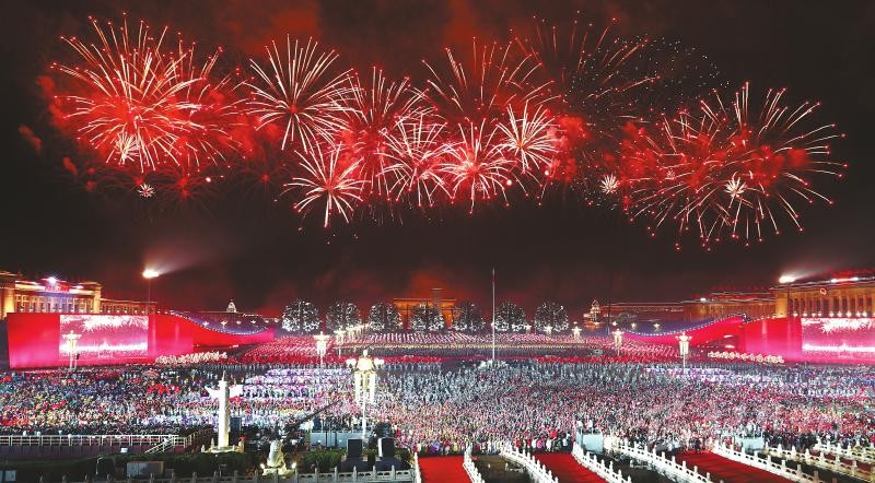 此刻,萬花綻放,“人民萬歲”造型照亮廣場(chǎng),照亮每個(gè)人的臉龐。