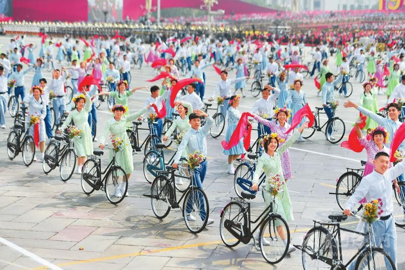 在10月1日上午進行的國慶70周年群眾游行中,上百名少男少女騎著自行車從廣場通過。這個主題為“青春萬歲”的場景喚醒了很多人對20世紀(jì)80年代的時代記憶……這是本次群眾游行中的第一個情境式行進。
