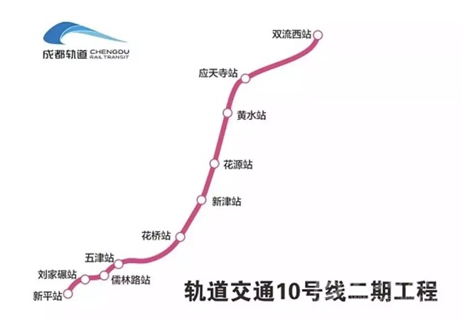 10號(hào)線二期起于一期雙流機(jī)場(chǎng)2航站樓站,串聯(lián)了雙流機(jī)場(chǎng)、雙流西客運(yùn)樞紐至新津主城區(qū),止于新津縣新平鎮(zhèn),線路全長(zhǎng)27.06km,高架段及過渡段設(shè)車站10座,其中地下站5座,高架站5座。
