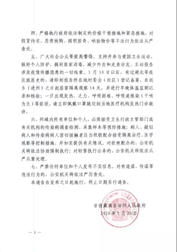 2020年1月24日,我州已全面啟動(dòng)突發(fā)公共衛(wèi)生事件I級(jí)應(yīng)急響應(yīng)。根據(jù)《中華人民共和國突發(fā)事件應(yīng)對(duì)法》《中華人民共和國傳染病防治法》《突發(fā)公共衛(wèi)生事件應(yīng)急條例》等法律法規(guī),為確保人民群眾生命安全和身體健康,現(xiàn)就加強(qiáng)我州新型冠狀病毒感染的肺炎聯(lián)防聯(lián)控工作有關(guān)事宜通告如下。一、自本通告發(fā)布之日起,全州所有旅游景區(qū)景點(diǎn)、圖書館、文化館、博覽館、電影院、歌舞娛樂場所、洗浴場所、網(wǎng)吧、宗教活動(dòng)場所等人員密集場所暫停營業(yè)(或?qū)ν忾_放),并暫停涉旅企業(yè)組織的團(tuán)隊(duì)旅游活動(dòng)。二、疫情防控期間,一律取消或延遲集會(huì)展覽、文化體育、集體宗教活動(dòng)等群眾性聚集活動(dòng)。禁止任何集體、個(gè)人和餐飲服務(wù)單位舉辦任何形式的群體性聚會(huì)、聚餐活動(dòng)。如遇婚禮請(qǐng)取消或延遲舉辦;喪事一律從簡并嚴(yán)格控制參加人數(shù)、落實(shí)防控措施。餐飲服務(wù)單位、鄉(xiāng)廚和專業(yè)加工團(tuán)隊(duì)不得承辦群體性聚餐宴席(包括農(nóng)村壩壩宴)。三、關(guān)閉活禽交易宰殺市場,禁止在集貿(mào)市場銷售、宰殺活禽和從事野生動(dòng)物捕獵、交易,野生動(dòng)物飼養(yǎng)繁育場所應(yīng)當(dāng)實(shí)施隔離措施,禁止餐飲服務(wù)單位和個(gè)人使用野生動(dòng)物加工、制售食品。四、嚴(yán)格執(zhí)行政府依法制定的價(jià)格干預(yù)措施和緊急措施,對(duì)假冒偽劣、惡意搶購、囤積居奇、哄抬物價(jià)等不法行為依法從嚴(yán)查處。五、廣大社會(huì)公眾要提高警惕,支持并參與愛國衛(wèi)生運(yùn)動(dòng),做好個(gè)人防護(hù),搞好居家消毒,減少外出和走親訪友,主動(dòng)報(bào)告涉及疫情傳播隱患的一切線索。1月10日以后,有過湖北等疫區(qū)旅居史的,請(qǐng)即刻報(bào)告所在地村委會(huì)(社區(qū))登記備案,自返鄉(xiāng)(進(jìn)州)之日起居家隔離觀察14天,并進(jìn)行早晚體溫監(jiān)測記錄和核驗(yàn);一旦出現(xiàn)發(fā)熱、乏力、呼吸困難、呼吸道感染(干咳為主)等癥狀,請(qǐng)立即佩戴口罩就近到當(dāng)?shù)蒯t(yī)療機(jī)構(gòu)發(fā)熱門診就診。六、州域內(nèi)所有單位和個(gè)人,必須接受衛(wèi)生行政主管部門或有關(guān)機(jī)構(gòu)的傳染病調(diào)查檢測、采集樣本等預(yù)防措施;病人、疑似病人和傳染病病人密切接觸者應(yīng)當(dāng)積極配合接受隔離治療、醫(yī)學(xué)觀察等控制措施,并如實(shí)提供有關(guān)情況。對(duì)拒絕配合的,公安機(jī)關(guān)將依法協(xié)助強(qiáng)制執(zhí)行;對(duì)妨害執(zhí)行公務(wù)的,公安機(jī)關(guān)將依法從嚴(yán)從重處理。七、嚴(yán)禁任何單位和個(gè)人發(fā)布不實(shí)信息,對(duì)有造謠、傳謠等違法行為的,公安機(jī)關(guān)將依法嚴(yán)厲查處。本通告自發(fā)布之日起施行,終止日期另行通告。