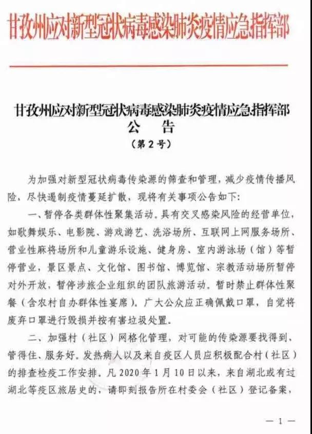一、暫停各類群體性聚集活動。具有交叉感染風(fēng)險的經(jīng)營單位,如歌舞娛樂、電影院、游戲游藝、洗浴場所、互聯(lián)網(wǎng)上網(wǎng)服務(wù)場所、營業(yè)性麻將場所和兒童游樂設(shè)施、健身房、室內(nèi)游泳場(館)等暫停營業(yè),景區(qū)景點、文化館、圖書館、博覽館、宗教活動場所暫停對外開放,暫停涉旅企業(yè)組織的團(tuán)隊旅游活動。暫時禁止群體性聚餐(含農(nóng)村自辦群體性宴席)。廣大公眾應(yīng)正確佩戴口罩,自覺將廢棄口罩進(jìn)行毀損并按有害垃圾處置。二、加強(qiáng)村(社區(qū))網(wǎng)格化管理,對可能的傳染源要找得到、管得住、服務(wù)好。發(fā)熱病人以及來自疫區(qū)人員應(yīng)積極配合村(社區(qū))的排查檢疫工作安排。凡2020年1月10日以來,來自湖北或有過湖北等疫區(qū)旅居史的,請即刻報告所在村委會(社區(qū))登記備案,并自進(jìn)州之日起自覺居家隔離14天。同時,當(dāng)?shù)蒯t(yī)療衛(wèi)生機(jī)構(gòu)要做好健康登記工作,一旦出現(xiàn)發(fā)熱、乏力、呼吸困難、呼吸道感染(干咳為主)等癥狀,請立即佩戴口罩就近到當(dāng)?shù)蒯t(yī)療機(jī)構(gòu)發(fā)熱門診就診。即將外出務(wù)工人員離開現(xiàn)居住地時,主動到就近醫(yī)療衛(wèi)生機(jī)構(gòu)接受健康檢查。三、暫停全州活畜禽交易及宰殺經(jīng)營行為,實行活畜禽定點宰殺、集中檢疫、白條禽(肉)上市。市場主辦單位或個人要按衛(wèi)生防疫要求對交易場所、設(shè)施設(shè)備進(jìn)行清洗消毒,活禽宰殺設(shè)施等要符合動物防疫、衛(wèi)生等相關(guān)要求,實行封閉管理,并與銷售區(qū)域?qū)嵭形锢砀綦x。禁止從事野生動物捕獵、交易,野生動物飼養(yǎng)繁育場所應(yīng)實施隔離措施,禁止餐飲服務(wù)單位和個人使用野生動物加工、制售食品。加強(qiáng)對涉畜禽人員相關(guān)防控知識宣傳和教育,指導(dǎo)其做好健康防護(hù)工作。四、州域內(nèi)所有單位和個人,必須接受衛(wèi)生行政主管部門或有關(guān)機(jī)構(gòu)的流行病學(xué)調(diào)查,確診或疑似病例應(yīng)全力配合有關(guān)機(jī)構(gòu)落實傳染病的調(diào)查、樣本采集、檢測、集中隔離治療等防控措施,不得隱報、緩報、謊報或者授意他人隱報、緩報、謊報有關(guān)情況。對拒絕配合的,公安機(jī)關(guān)將依法協(xié)助強(qiáng)制執(zhí)行;對妨礙執(zhí)行公務(wù)的,公安機(jī)關(guān)將依法從嚴(yán)從重處理。五、對重點醫(yī)療防控物資實行統(tǒng)一收儲、統(tǒng)一調(diào)配。甘孜州應(yīng)對新型冠狀病毒感染肺炎疫情應(yīng)急指揮部