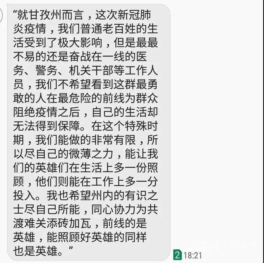 加勇一邊從兜里拿出1000元往鄉(xiāng)干部手中遞,一邊說(shuō)到:“這個(gè)是我跟我兒子捐給國(guó)家的,錢(qián)不多,我們兩人一個(gè)人500,麻煩你們鄉(xiāng)上幫到捐一下。以前,我在擔(dān)任村干部期間,國(guó)家給了我和家人很多關(guān)懷和照顧,現(xiàn)在我們?nèi)袊?guó)都在齊心協(xié)力防治新型冠狀病毒感染的肺炎疫情,作為一個(gè)老黨員,還是原來(lái)的村支部書(shū)記,我們一家人想為國(guó)家盡點(diǎn)力,這個(gè)錢(qián)不多,但是我想能有捐一點(diǎn)算一點(diǎn)嘛。”