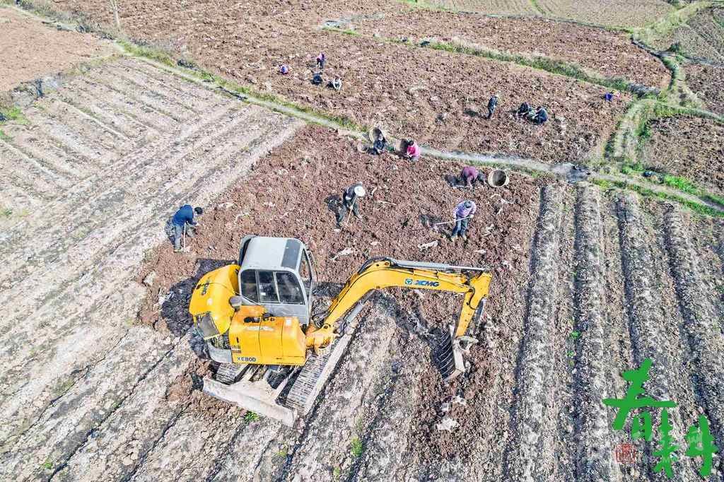 閬中市彭城鎮(zhèn)五谷臺(tái)村,機(jī)械正在菜地里開溝起壟施底肥,村民在播種蓋土。