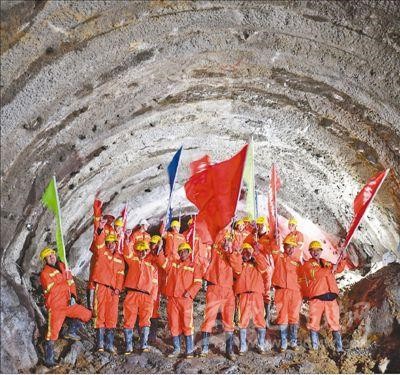 4月7日,施工人員慶祝川藏鐵路拉林段重點(diǎn)控制性工程米林隧道貫通。 新華社記者 覺(jué) 果攝