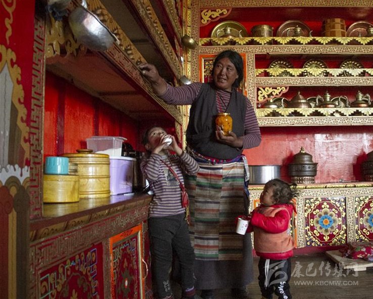 5月30日,四川甘孜藏族自治州理塘縣奔戈鄉(xiāng)卡灰村村民阿曲在家中照看外孫和外孫女。新華社記者 李夢(mèng)馨 攝