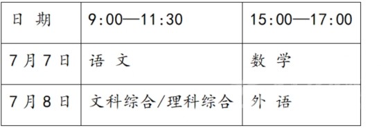 全省高考(一類模式高考除外)于7月7、8日統(tǒng)一組織進(jìn)行。各科目考試時間(北京時間)安排如下: