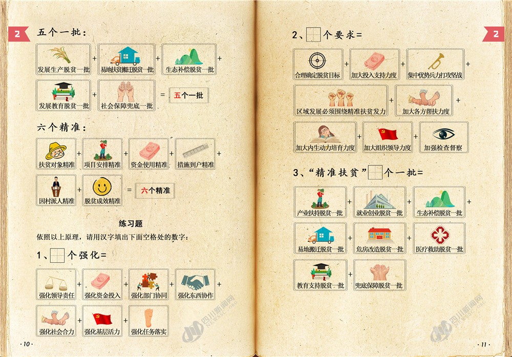 四川新聞網(wǎng)成都8月26日訊 又是周三啦?說(shuō)好的脫貧攻堅(jiān)小課堂如期而至!目前,打贏脫貧攻堅(jiān)戰(zhàn)進(jìn)入最后沖刺的關(guān)鍵階段,四川還有很多硬仗要打,很多“硬骨頭”要啃,防止返貧致貧任務(wù)繁重,脫貧攻堅(jiān)工作力度還需要加強(qiáng),面臨的困難和挑戰(zhàn)依然十分艱巨。為了深入推進(jìn)精準(zhǔn)扶貧精準(zhǔn)脫貧,奪取全省脫貧攻堅(jiān)收官之戰(zhàn)全面勝利,本課采用上一課剛剛學(xué)到的數(shù)字來(lái)總結(jié)歸納了脫貧攻堅(jiān)政策和方法的關(guān)鍵知識(shí)點(diǎn),以便讓廣大同學(xué)進(jìn)一步掌握這些政策、運(yùn)用這些方法,提高政策受益覆蓋面及知曉率,確保各項(xiàng)政策落到實(shí)處。