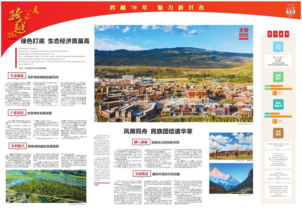 為慶祝甘孜建州70周年,《四川日?qǐng)?bào)》于9月15日推出八連版特別報(bào)道,整體以紅色打底,充滿喜慶的祝福。