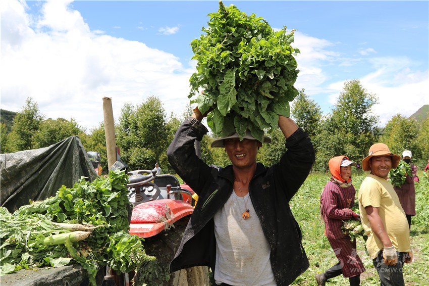 去年5月,記者站在海拔3600米的蘿卜種植基地,天空正飄著細雨,舉目是云霧繚繞的雪山,雨水滴落在四千多畝青綠色的蘿卜地上,白蘿卜已從土里探出頭來,似乎在等待采收。一股清甜的蘿卜味,伴隨著雨地里收割者的嬉笑聲,撲面而來。