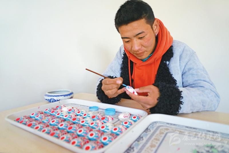 本著自主自愿的原則,教學班結束后,65名藏族青年主動加入扶貧彩繪實訓班,成為項目的第一批學員?!皩嵱柶陂g不需要交任何費用,還包吃住。我對畫京劇臉譜很有興趣,我們第一個月學習繪畫基本功,第二個月開始,根據成品質量,就可以計件得酬勞,學習期間我每月能掙500多元?!壁雠f。