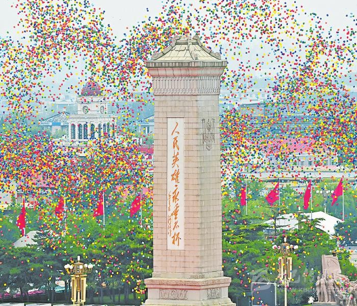 天安門城樓燈火璀璨,廣場上慶祝大會(huì)的準(zhǔn)備工作緊鑼密鼓。三軍儀仗隊(duì)、解放軍聯(lián)合軍樂團(tuán),還有北京各高校學(xué)生組成的合唱團(tuán),正在進(jìn)行最后的排練。