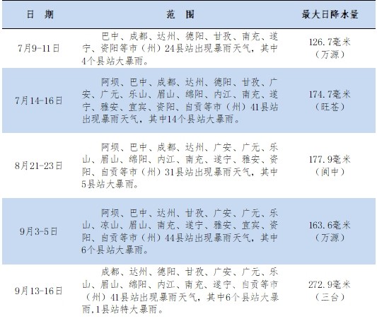 巴中、達(dá)州、廣安、南充、遂寧、資陽(yáng)、內(nèi)江和綿陽(yáng)8市有15縣站突破本站年降水量歷史最多記錄。