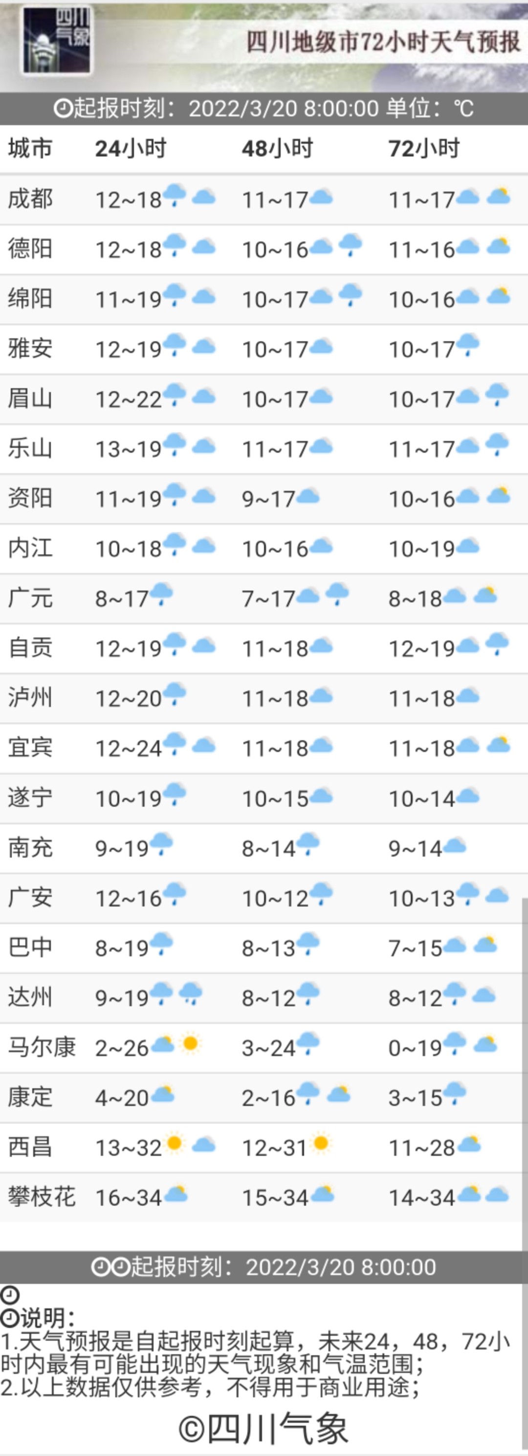 早在3月18日,四川省氣象臺(tái)便發(fā)出了強(qiáng)降溫黃色預(yù)警。預(yù)計(jì)19日傍晚~22日,盆地和涼山州東北部將有一次明顯的降溫降雨天氣過程,日平均氣溫將累計(jì)下降7~12℃,最高氣溫將下降15℃或以上;冷空氣影響時(shí)有3-5級(jí)偏北風(fēng),山口河谷風(fēng)力可達(dá)6級(jí)或以上,局部地方有短時(shí)強(qiáng)降水、雷暴大風(fēng)或冰雹等強(qiáng)對(duì)流天氣,其中盆地東北部、中部和南部有大雨到暴雨。