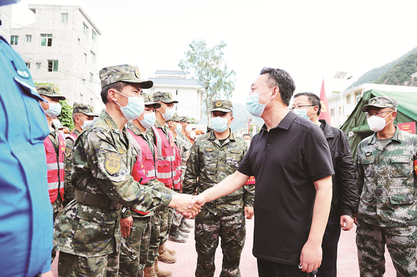 在德威鎮(zhèn)臨時(shí)安置點(diǎn),一頂頂藍(lán)色帳篷整齊排列,受災(zāi)群眾安心有序地生活。沈陽走進(jìn)安置點(diǎn),看望慰問了最后一批安全轉(zhuǎn)移的灣東村四組的基層黨員和群眾。他說,基層干部是群眾的主心骨,是戰(zhàn)勝一切艱難險(xiǎn)阻的最后防線。廣大基層黨員干部響應(yīng)號(hào)召、應(yīng)時(shí)而動(dòng)、沖鋒在前,當(dāng)向?qū)?、救傷員、查災(zāi)情、穩(wěn)民心,讓黨旗高高飄揚(yáng)在抗震救災(zāi)一線,用實(shí)際行動(dòng)踐行了初心使命。沈陽走進(jìn)帳篷仔細(xì)詢問受災(zāi)群眾,“吃的怎么樣?晚上冷不冷?還有什么困難?大家在帳篷中過中秋節(jié),你們受苦了……”。受災(zāi)群眾紛紛表達(dá)了對(duì)黨和政府的感激之情。沈陽說,全國(guó)全省人民十分關(guān)心災(zāi)情、紛紛伸出援助之手。當(dāng)前的困難是暫時(shí)的,有黨中央、國(guó)務(wù)院和省委、省政府的關(guān)心關(guān)懷和堅(jiān)強(qiáng)領(lǐng)導(dǎo),有各族群眾的團(tuán)結(jié)拼搏和艱苦奮斗,我們有信心有能力搞好災(zāi)后恢復(fù)重建,讓災(zāi)區(qū)人民重建美好家園、過上幸福生活。