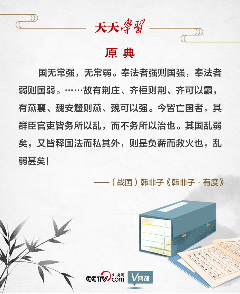 韓非子是戰(zhàn)國時期法家思想的集大成者?!坝卸取保褪怯蟹ǘ?。韓非子把“奉法”作為治亂興亡的關(guān)鍵,提出“國無常強(qiáng),無常弱。奉法者強(qiáng)則國強(qiáng),奉法者弱則國弱”。意思是,國家不會永遠(yuǎn)富強(qiáng),亦不會長久貧弱。執(zhí)行法度的人堅決,國家就會富強(qiáng);執(zhí)行法度的人軟弱,國家就會貧弱。
