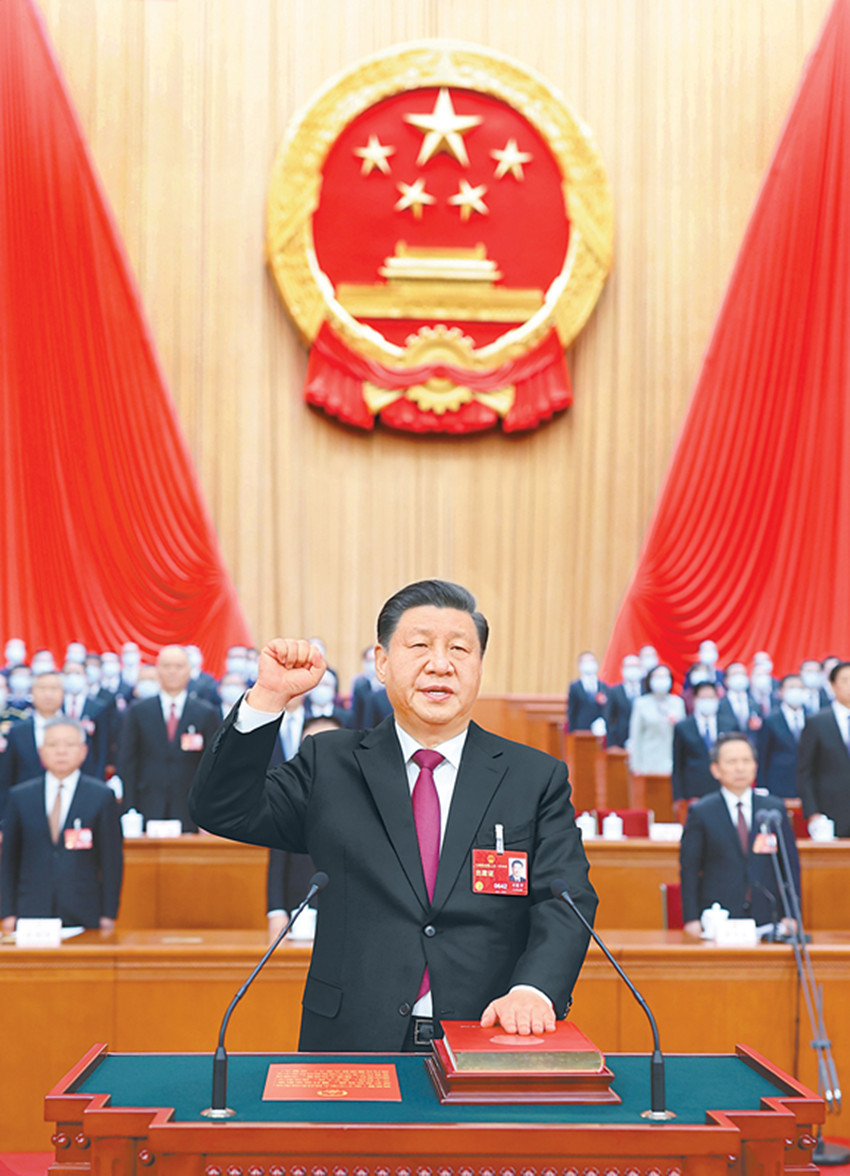 左手撫按憲法、右手舉拳,人民大會堂大禮堂內(nèi),習近平主席在近3000名全國人大代表見證下,莊嚴宣誓。