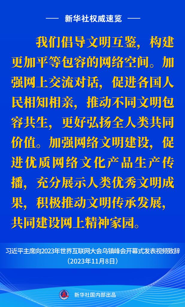 11月8日上午,國(guó)家主席習(xí)近平向2023年世界互聯(lián)網(wǎng)大會(huì)烏鎮(zhèn)峰會(huì)開(kāi)幕式發(fā)表視頻致辭。一起來(lái)看金句。
