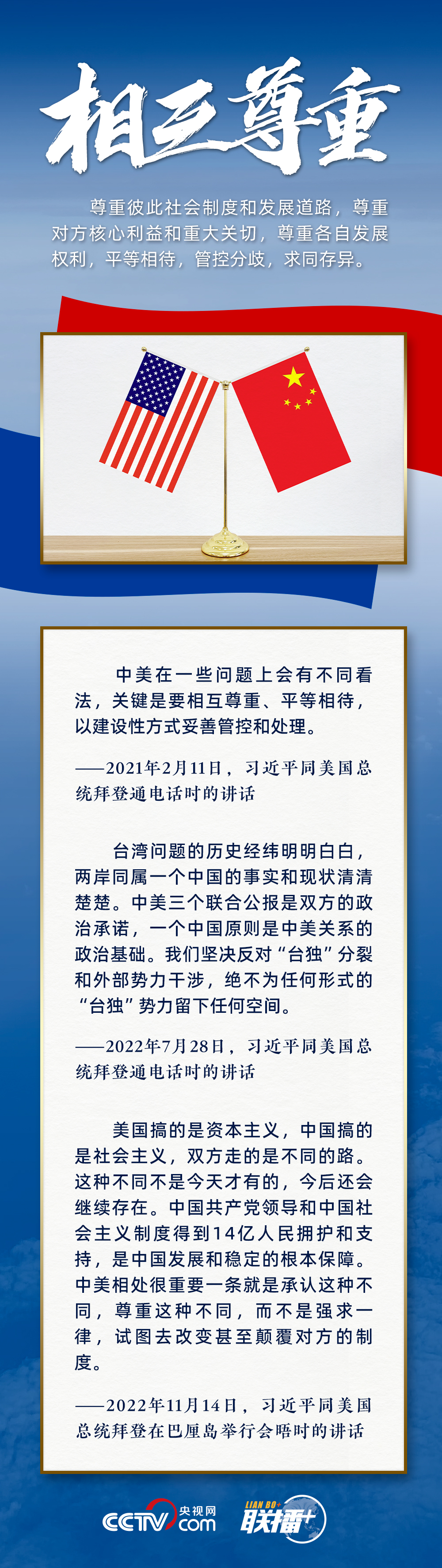當今世界最需要相互尊重,聚同化異。中美兩國歷史文化傳統(tǒng)、社會制度、意識形態(tài)不同,經濟發(fā)展水平各異,雙方存在不同看法、在一些問題上存在分歧和摩擦在所難免。中美雙方應該堅持從大處著眼,認清兩國共同利益遠遠大于分歧;應該相互尊重、平等相待,尊重彼此主權和領土完整,尊重彼此對發(fā)展道路的選擇,不把自己的意志和模式強加于對方;應該善于管控矛盾和摩擦,堅持通過對話協(xié)商、以建設性方式增進理解、擴大共識。